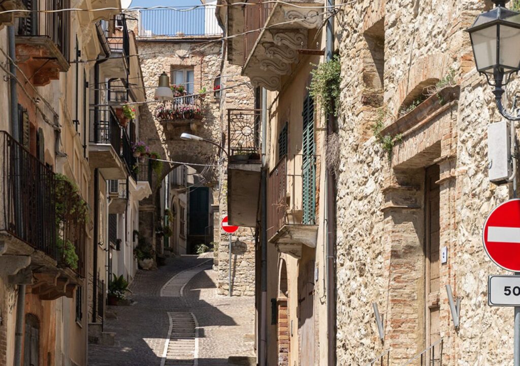 Una volta attraversata la piazza, vi invito a perdervi nei vicoli intrecciati del centro storico. Questo è il cuore pulsante di Archi, dove le strade strette e acciottolate si snodano come un intreccio di vite e storie personali. Mentre camminate, potrete scorgere belle case in pietra con portali incorniciati da fregi scolpiti, reminiscenze di un’arte artigianale che è quasi scomparsa altrove. Ascoltate la quiete del borgo interrotta solo dal canto degli uccelli e dal lieve bisbiglio delle conversazioni in dialetto abruzzese.